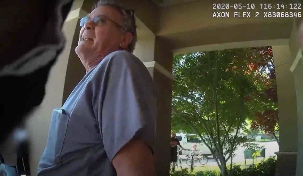 After this point, the officer appears to make physical contact with customers, but the body camera doesn't show if he initiates it or they initiate it. A cellphone video shot from behind showed a white-haired man either bumped or shoved out of the way — and on the body camera clip, that same man tells the officer "you did assault me, and I didn't do anything."