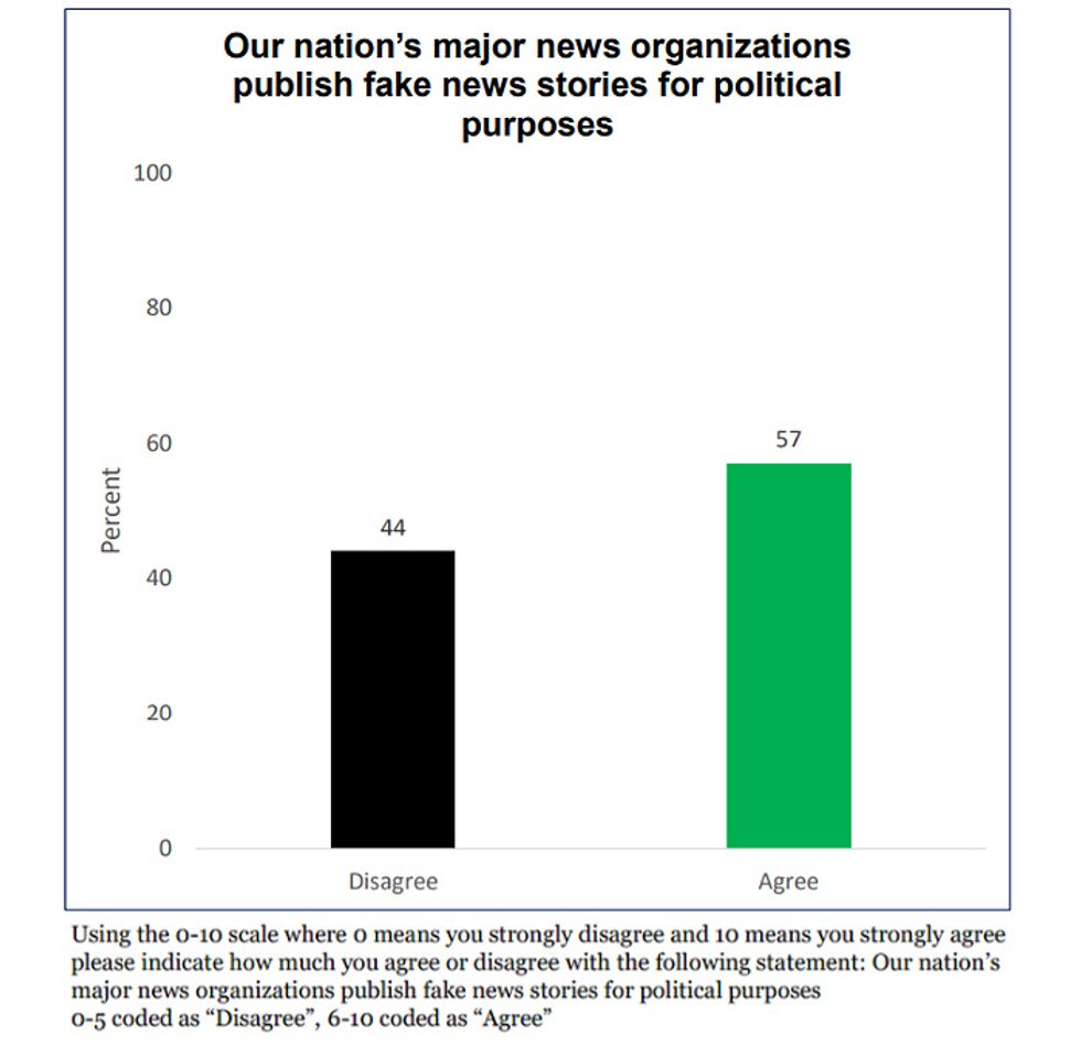 Here we ask voters to agree or disagree with the following statement :"Our nation's major news organizations publish fake news stories for political purposes." We were quite intentional about the wording. We wanted to be sure respondents understood we were talking about large, traditional media sources like our nation's major newspapers and not blogs or "fringe" sources.