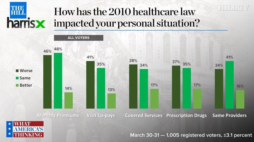 The poll conducted by Harris X for The Hill says that only 14 percent of respondents said that their monthly premiums were better because of Obamacare.
