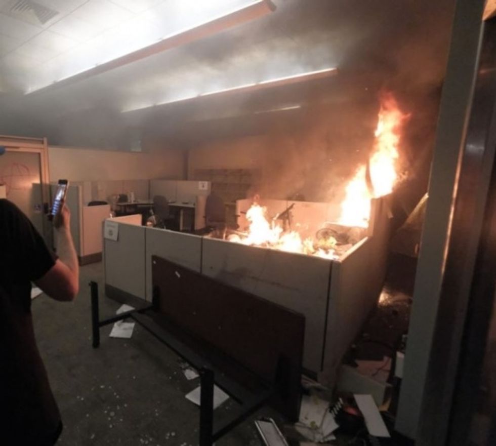 The department said about 30 rioters entered the Justice Center through the broken windows, spray-painted parts of the office, destroyed office equipment and computers, and started fires.