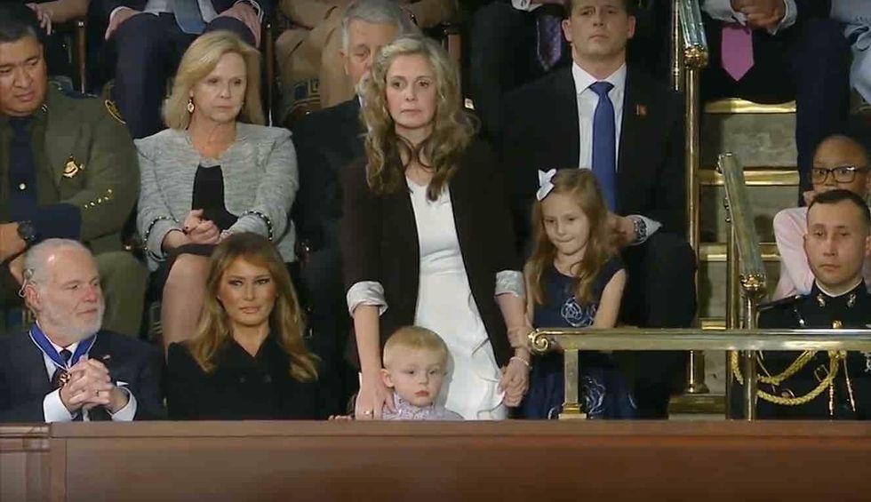 President Donald Trump spent a few moments of his State of the Union address Tuesday night honoring military spouse Amy Williams from Fort Bragg, North Carolina, and her two children, 6-year-old Elliana and 3-year-old Rowan, KGO-TV reported.