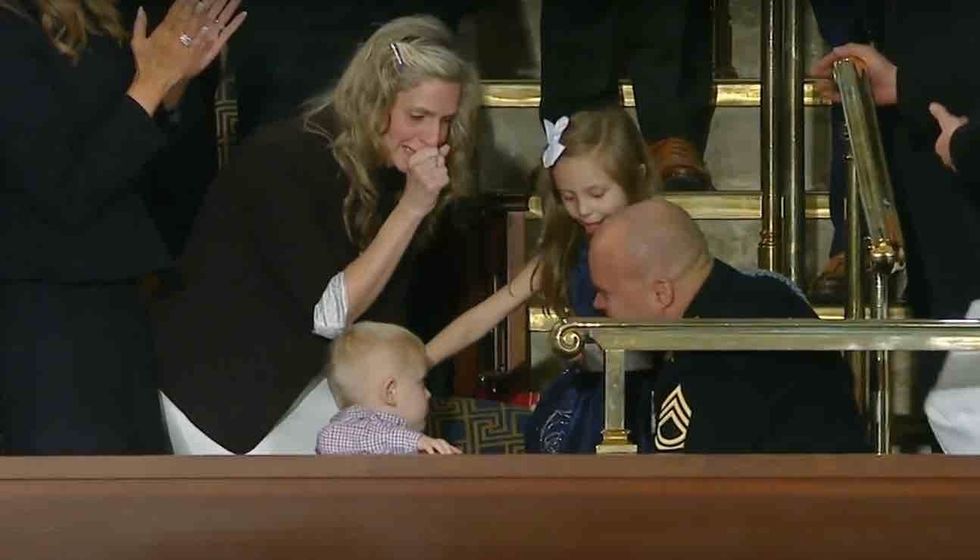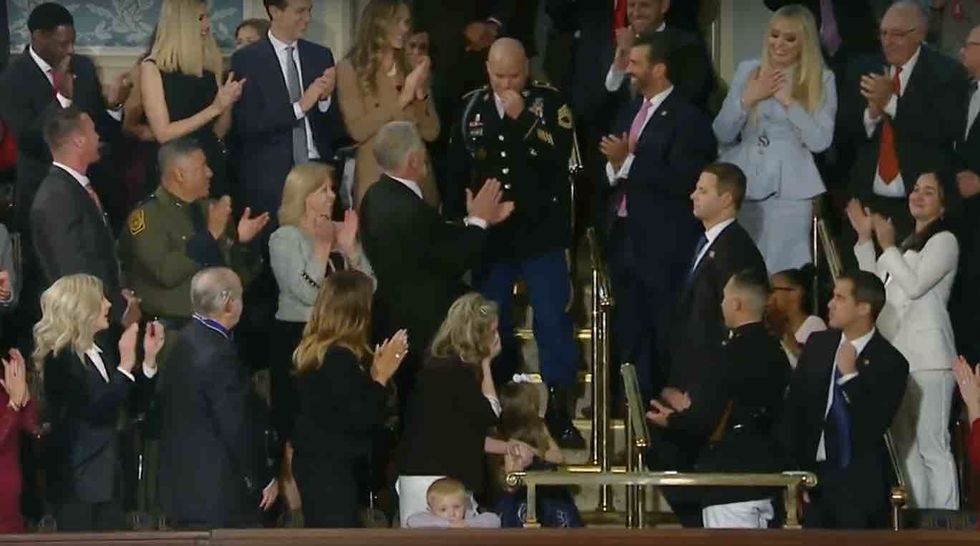 "But Amy, there is one more thing. Tonight we have a very special surprise. I am thrilled to inform you that your husband is back from deployment. He is here with us tonight, and we couldn't keep him waiting any longer," Trump said as Sgt. Williams walked down the steps as the chamber erupted.