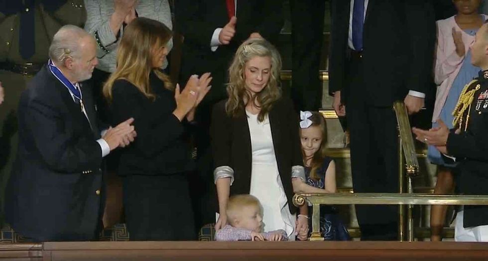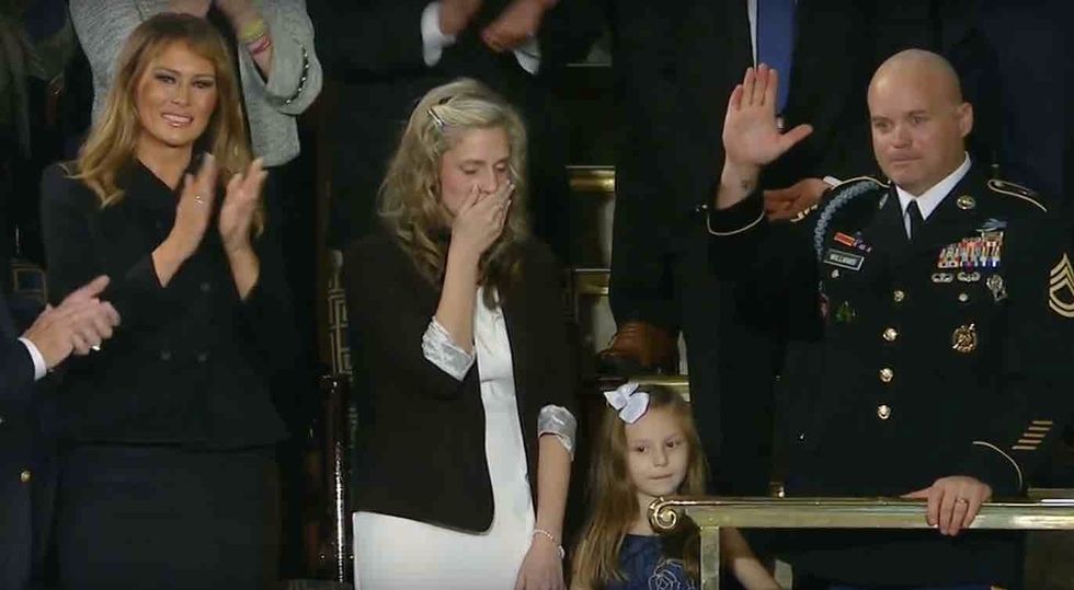 "Amy works full time and volunteers countless hours helping other military families," Trump said as cameras trained upon Williams and her kids, who were seated next to first lady Melania Trump. "For the past seven months, she has done it all while her husband, Sgt. First Class Townsend Williams, is in Afghanistan on his fourth deployment to the Middle East."