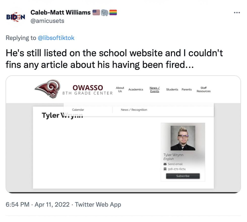 "Tyler Wrynn is no longer in the classroom, and the Board of Education accepted his resignation on April 11 at its regular monthly meeting," Owasso Public Schools told TheBlaze in a statement Tuesday. "As this is a personnel issue, we are unable to provide further comment."