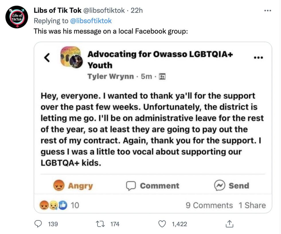 In addition, Libs of Tik Tok posted a screenshot of a message Wrynn purportedly posted in a private Facebook group detailing the situation: