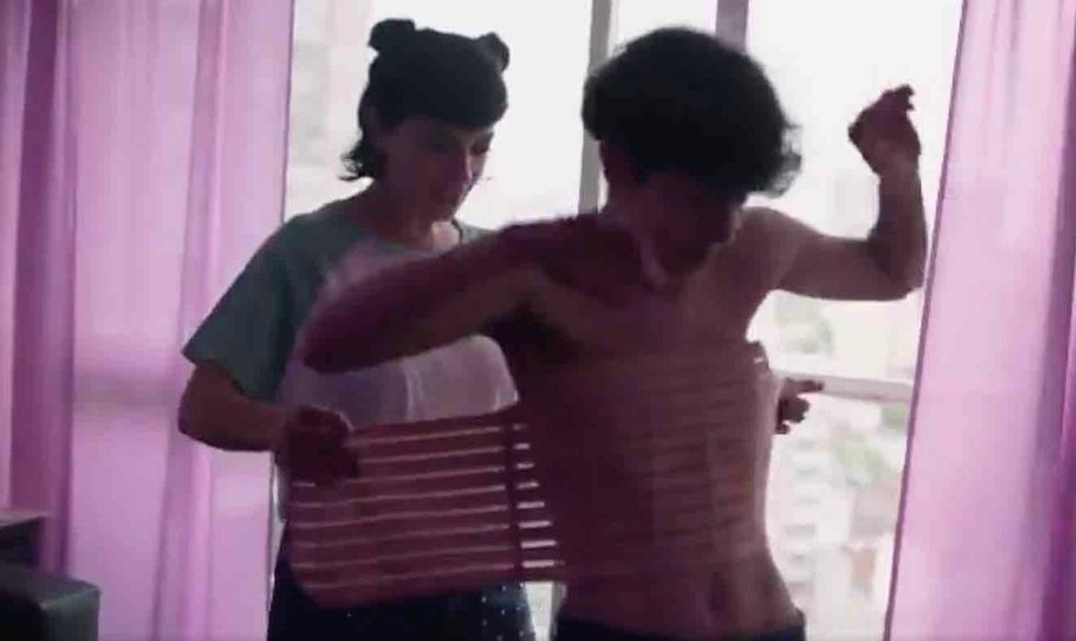Another mother is seen helping her daughter wrap a binder around her torso in order to flatten her breasts: