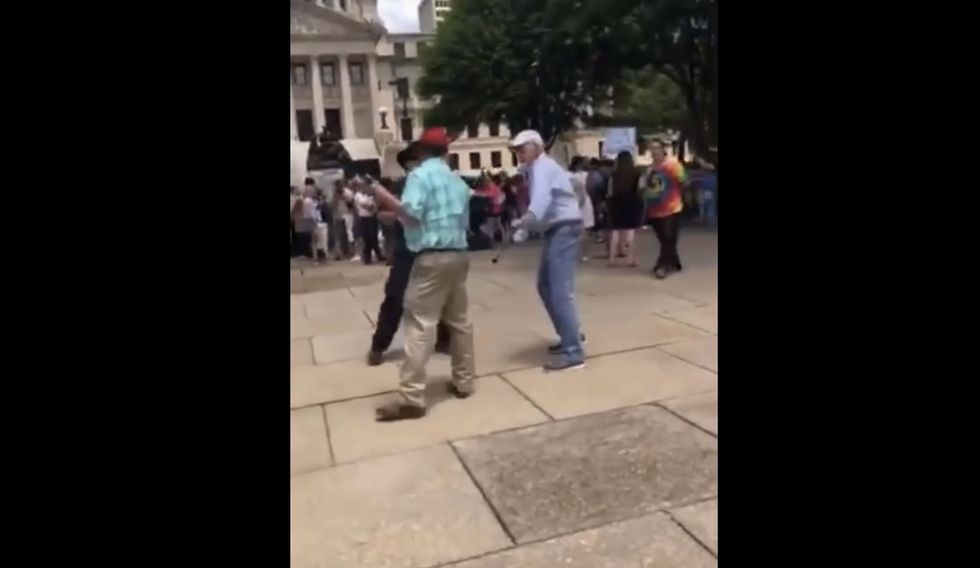 One of them holding a cane was seen using it to jab Boyd, who replied by saying, "Call the cops. He just hit me with his cane."
