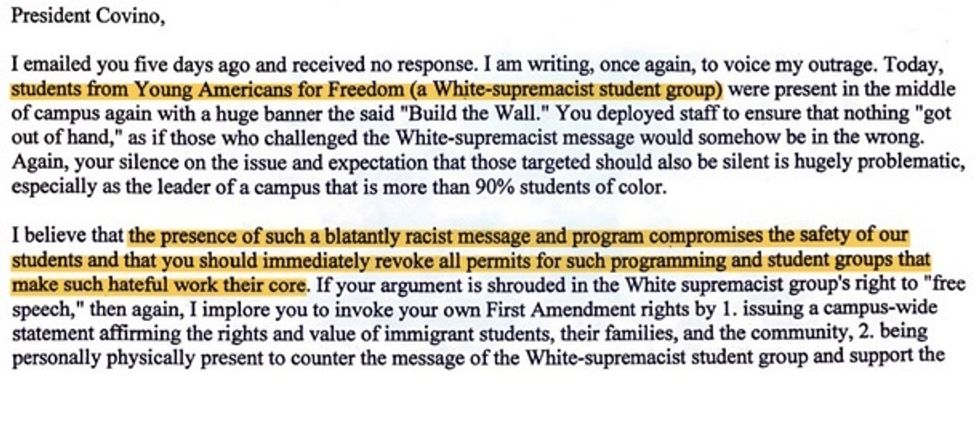 Young America's Foundation also obtained an email to Covino from Melina Abdullah, a professor and former chair of Pan-African Studies, who voiced her "outrage" over Young Americans for Freedom — which she called "a white-supremacist student group" — and their "blatantly racist" pro-border wall stance. And she even urged the school's president to "immediately revoke all permits for such programming and student groups that make such hateful work their core," Young America's Foundation added: