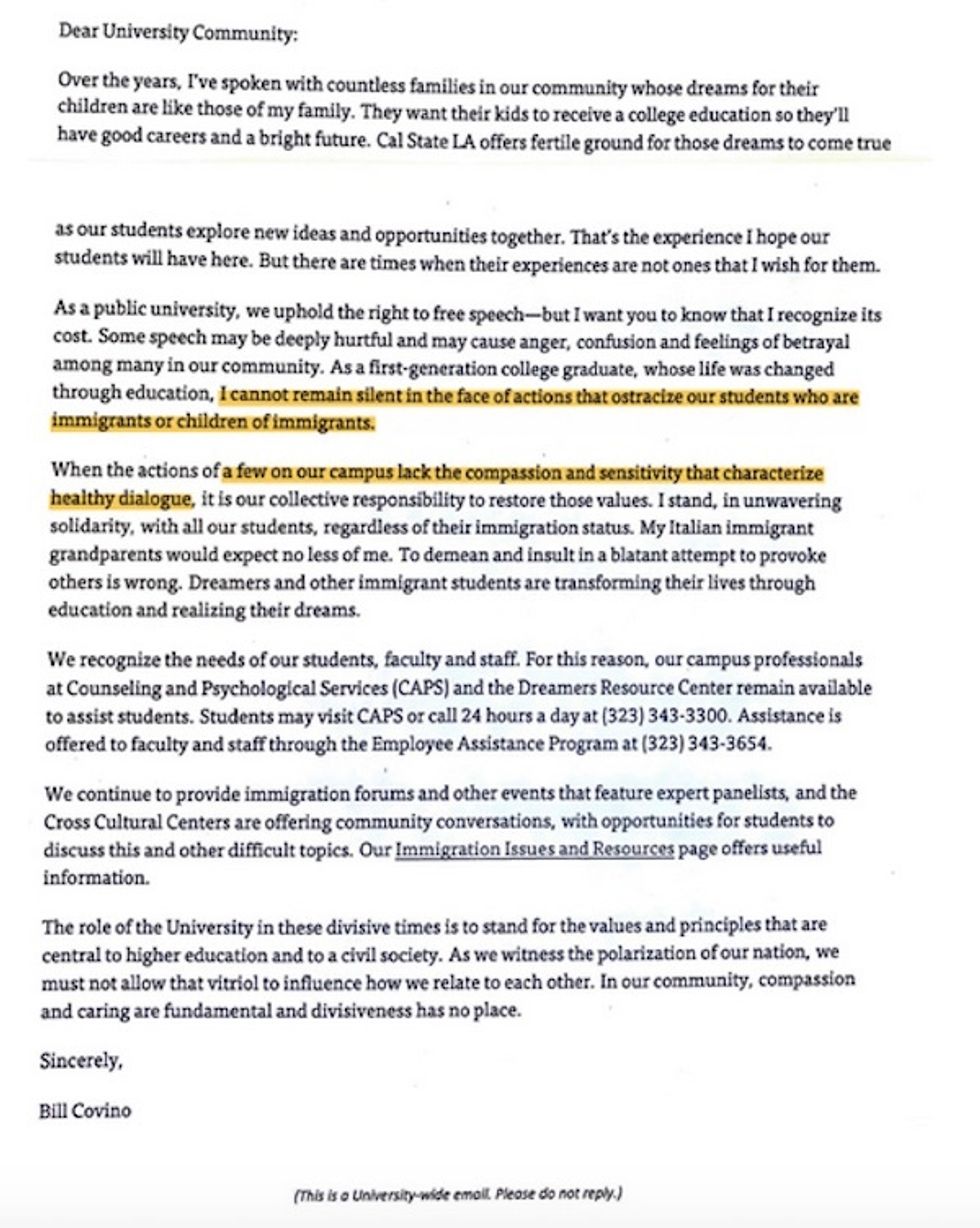 CSULA President William Covino wrote an email to the university community that said he "cannot remain silent in the face of actions that ostracize our students who are immigrants or children of immigrants" and then blasted "the actions of a few on our campus [who] lack the compassion and sensitivity that characterize healthy dialogue," Young America's Foundation reported: