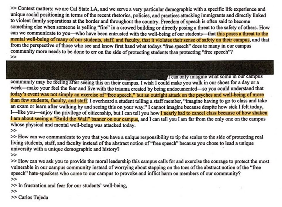 Professors, administrators, and staff at California State University, Los Angeles, were "emotionally and physically triggered" by pro-border wall students' activism, according to a flurry of internal emails obtained by Young America's Foundation — one of which accused its conservative student outfit, Young Americans for Freedom, of being a "white supremacist" group.