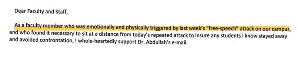 "Many of us have and will continue to oppose the racists, up to and including putting our bodies between them and our students, as in the infamous Shapiro-inspired aggression," Steve Teixeira, a career services specialist at CSULA, wrote, according to Young America's Foundation.