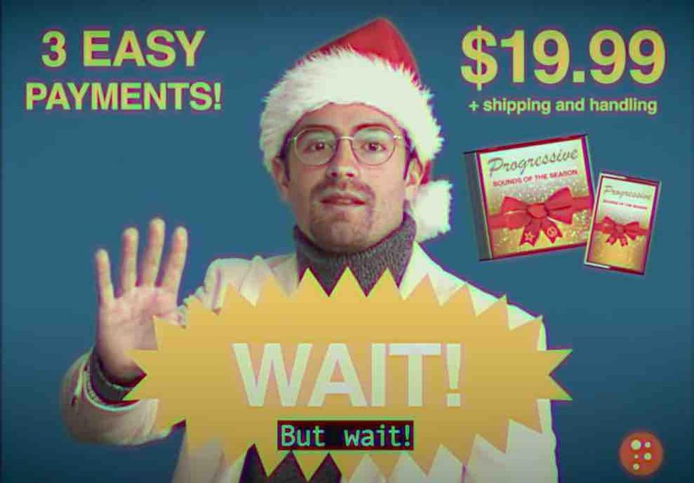 And "Progressive Sounds of the Season" can be yours after three easy payments of $19.99 — and he adds that if you call right now, a "Tax the Rich" sweater will be thrown in for the "small price of $69.99."