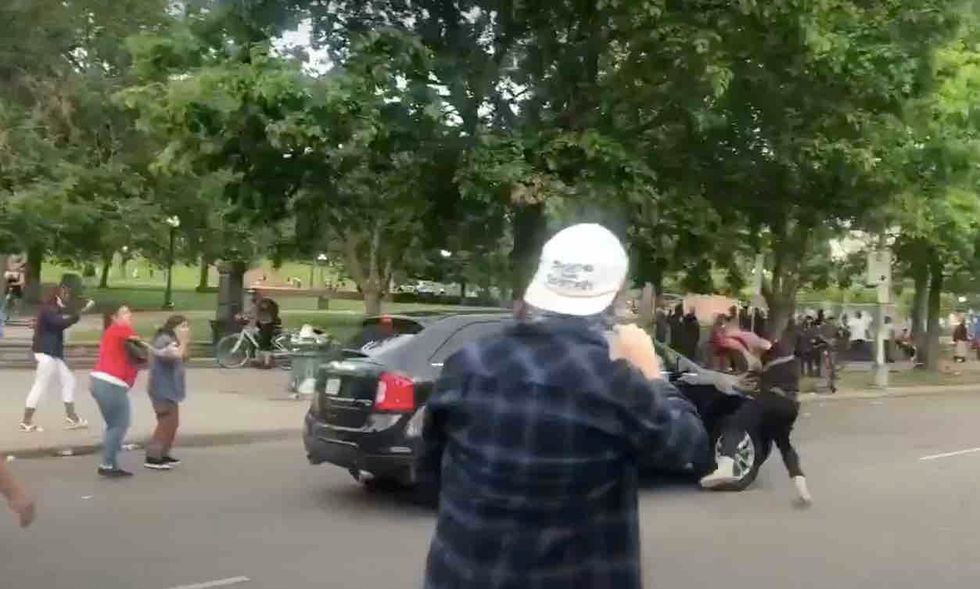 A different Twitter user commented that "I was there at this moment and was nearly run over myself, he was on the hood because she attempted to ram her car thru a crowd of us a first time. That's how he ended up there to begin with. It was a [Black Lives Matter] protest. She attempted to ram her car through an entire crowd of people."