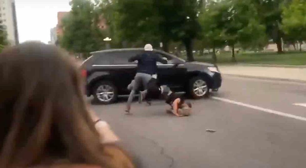 According to the Twitter user who posted the now-viral clip, the hit protester "was not on the hood of her car before she started moving. He jumped up because she wouldn't stop accelerating towards the people surrounding her car. 'It's illegal to jaywalk and block traffic.' It's illegal to murder an innocent human being."