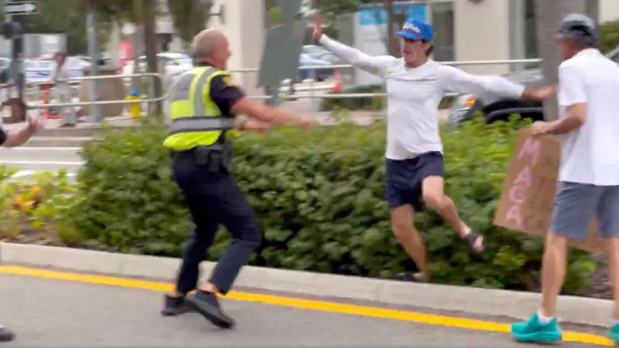 The video shows that Smith initially approached attendees, apparently taunting them and trying to get them to engage. When another attendee walked by he allegedly shoved him back several times before the police officer hopped the fence and pursued Smith.