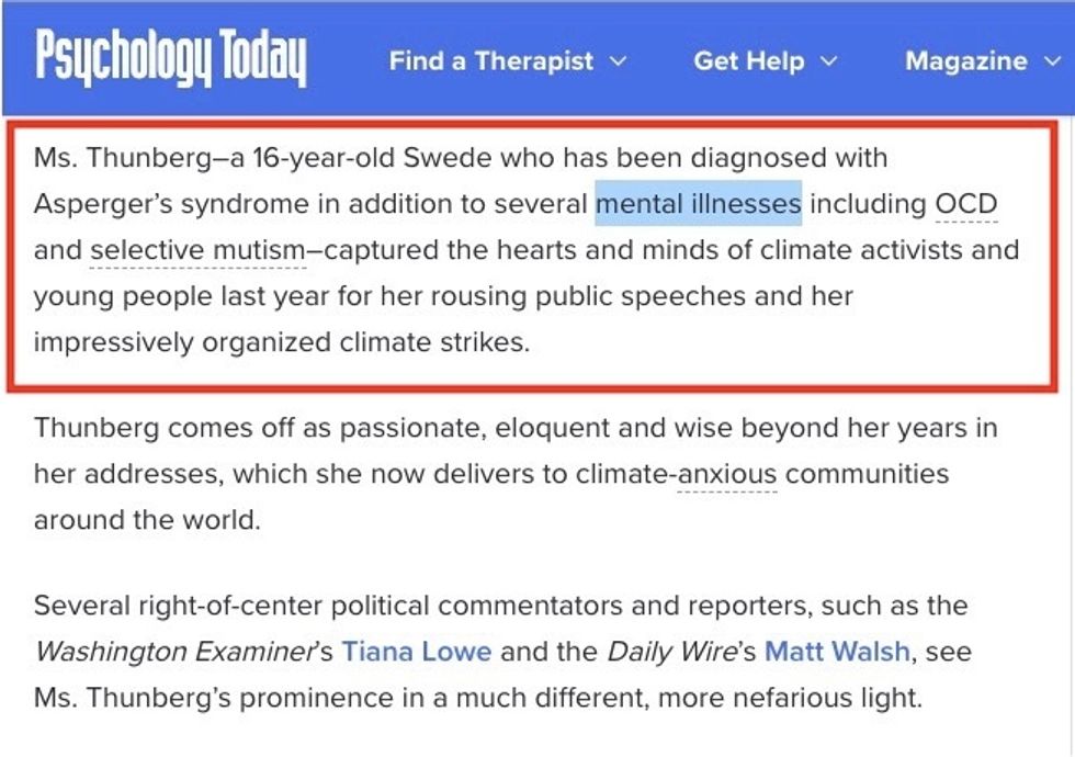 One could understand why Psychology Today characterizing Thunberg as having been diagnosed with "several mental illnesses" might be problematic given the piece later rips Michael Knowles of The Daily Wire for calling Thunberg a "mentally ill Swedish child" during his recent Fox News appearance.