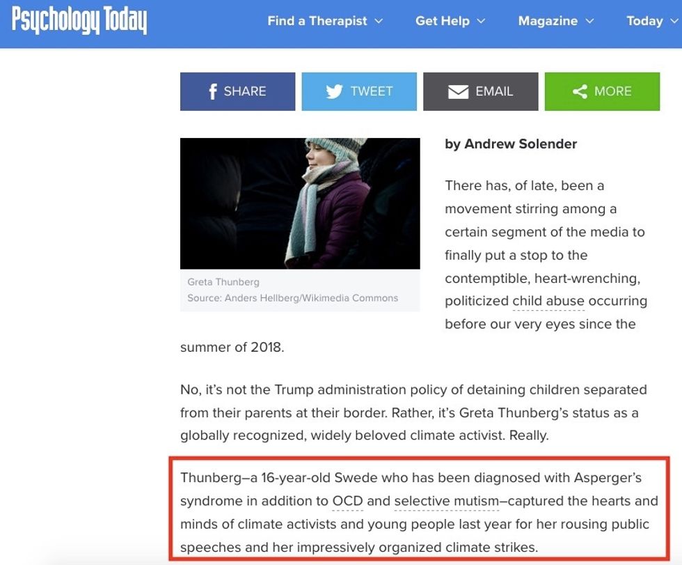 Psychology Today — the well-known magazine featuring articles by "renowned psychologists, academics, psychiatrists and writers" — posted a piece Wednesday titled, "Stop Infantilizing Greta Thunberg With Claims of 'Abuse.'"