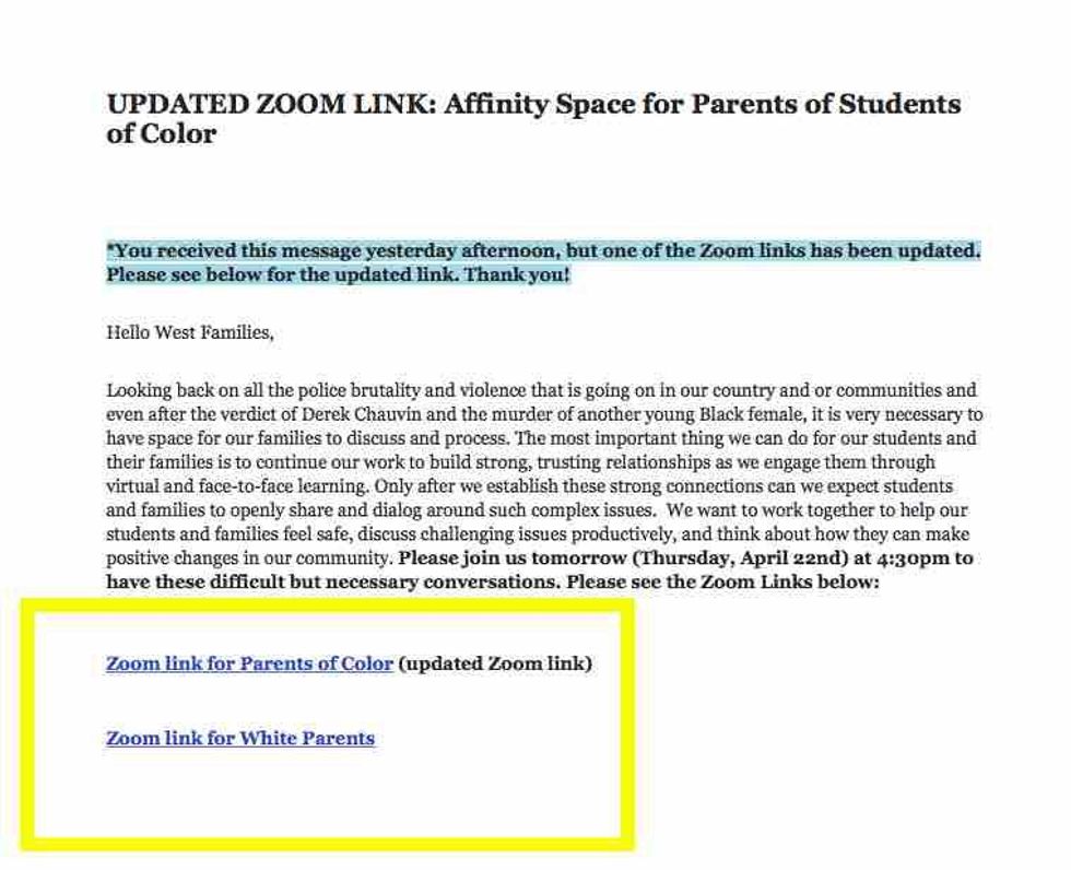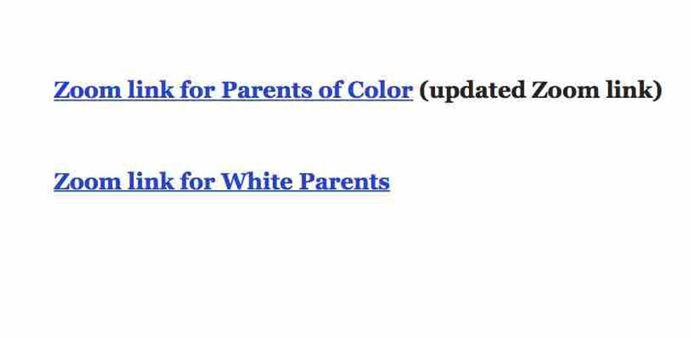 Thing is, the West High School notice about the meeting listed two Zoom links for accessing it: One "for Parents of Color" and another "for White Parents."