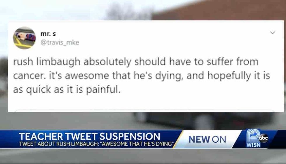 Milwaukee Public Schools placed a teacher on leave after he tweeted that conservative radio host Rush Limbaugh "absolutely should have to suffer from cancer. it's awesome that he's dying, and hopefully it is as quick as it is painful," WITI-TV reported.