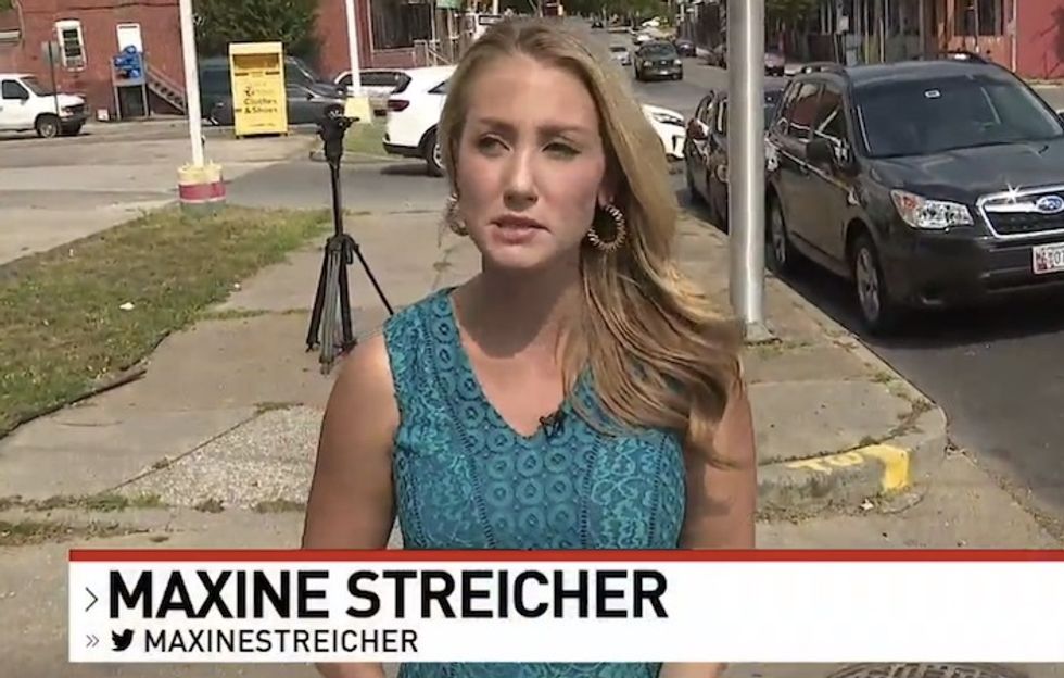 The station's segment continued with a live shot showing the trash-filled corner of an abandoned building while Streicher narrated: "We spoke with many people today who say the president should consider coming here to Baltimore to the Sandtown area and taking a look at things for himself."