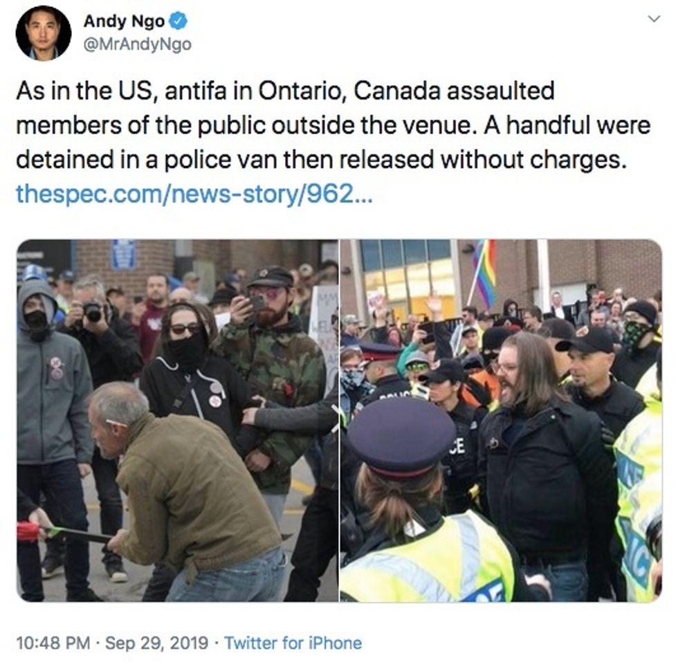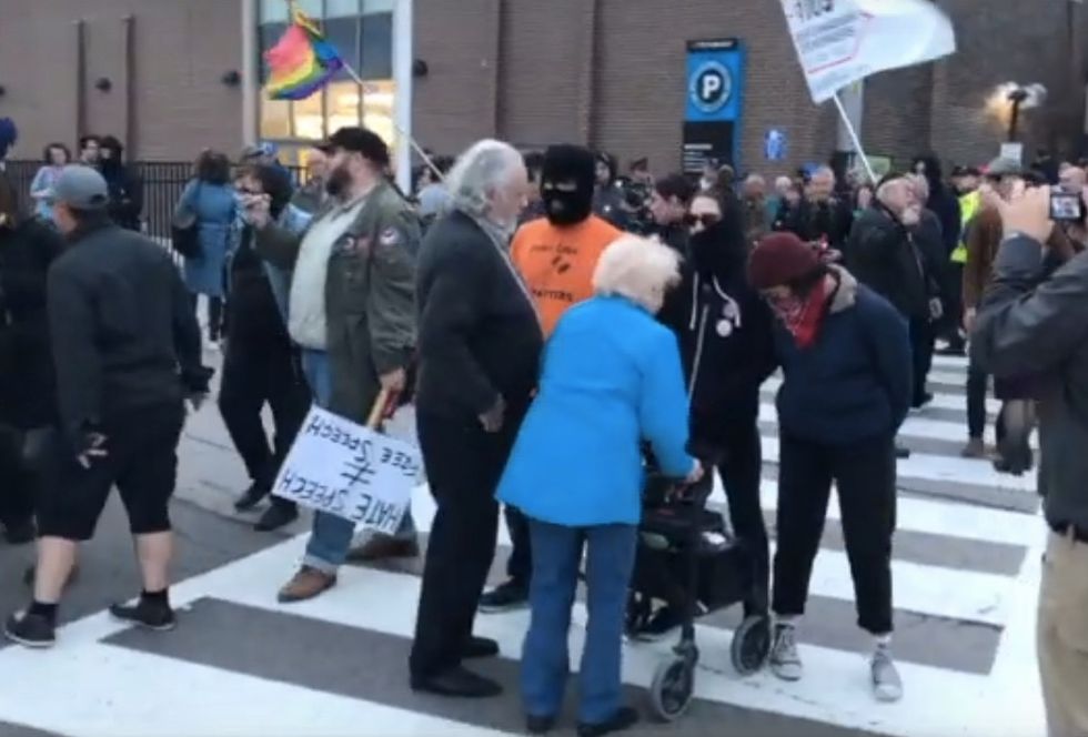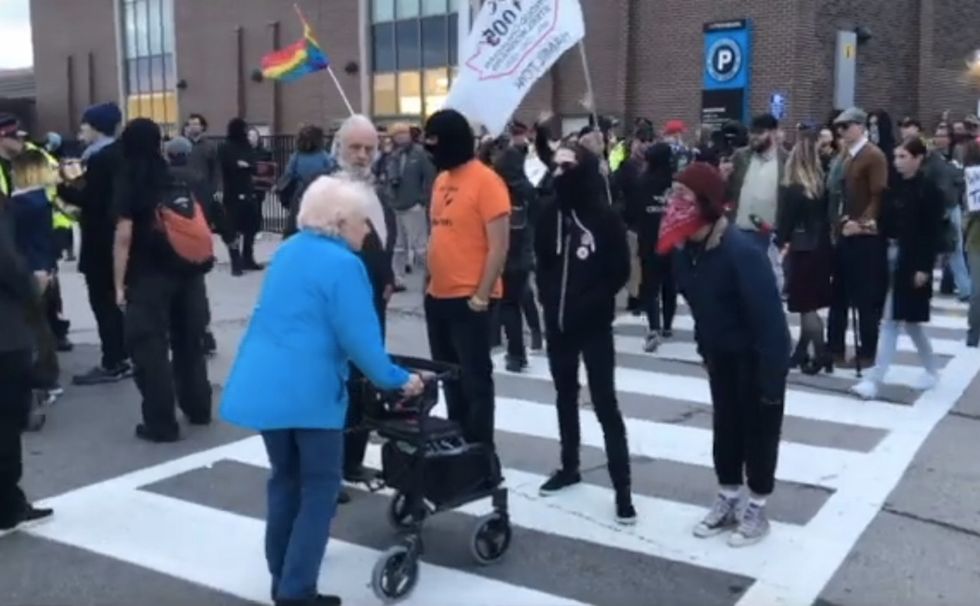 But that's exactly what happened Sunday outside Mohawk College in Hamilton, Ontario, when masked protesters identified as Antifa blocked the path of Henderson and his mother, who was using a walker to make her way into a conservative event.