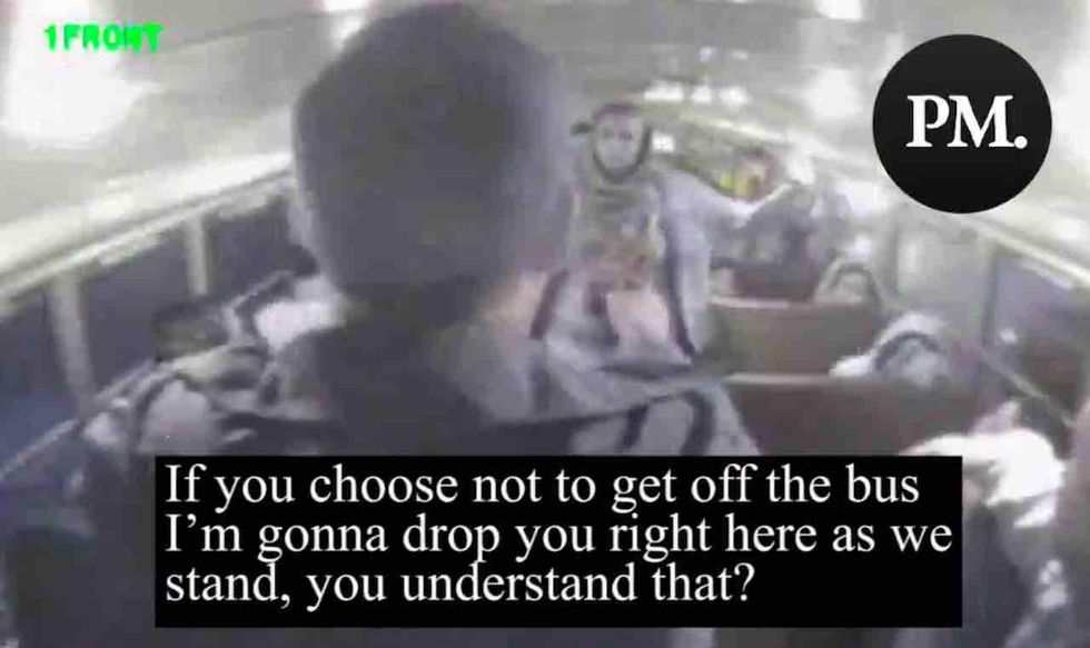"If you choose not to get off the bus I'm gonna drop you right here as we stand, do you understand that?" he tells Gardheere, who proves a quick study and raises her hands skyward.