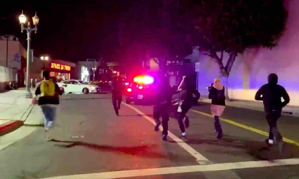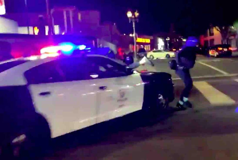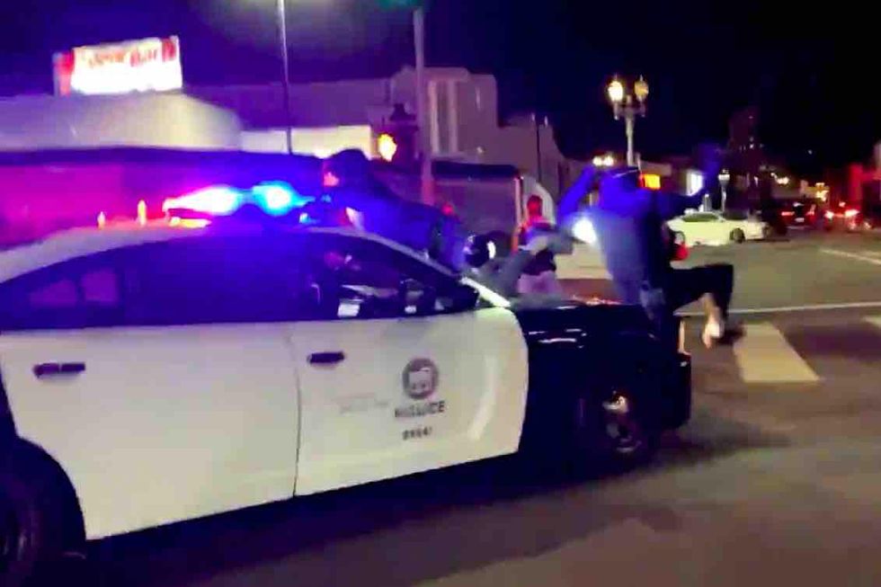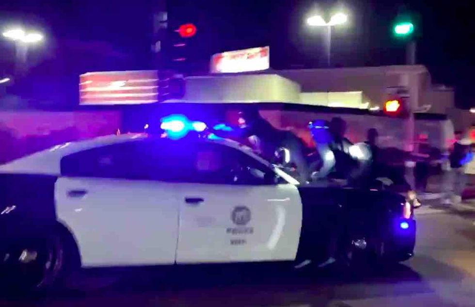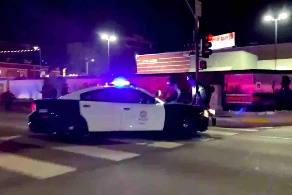 As the video in question turns to another intersection, an individual close the camera is heard repeating the mantra: "LAPD just ran over two protesters!" And as the camera is trained on a line of cops, the same voice by the camera is heard saying, "You guys just ran two people over."