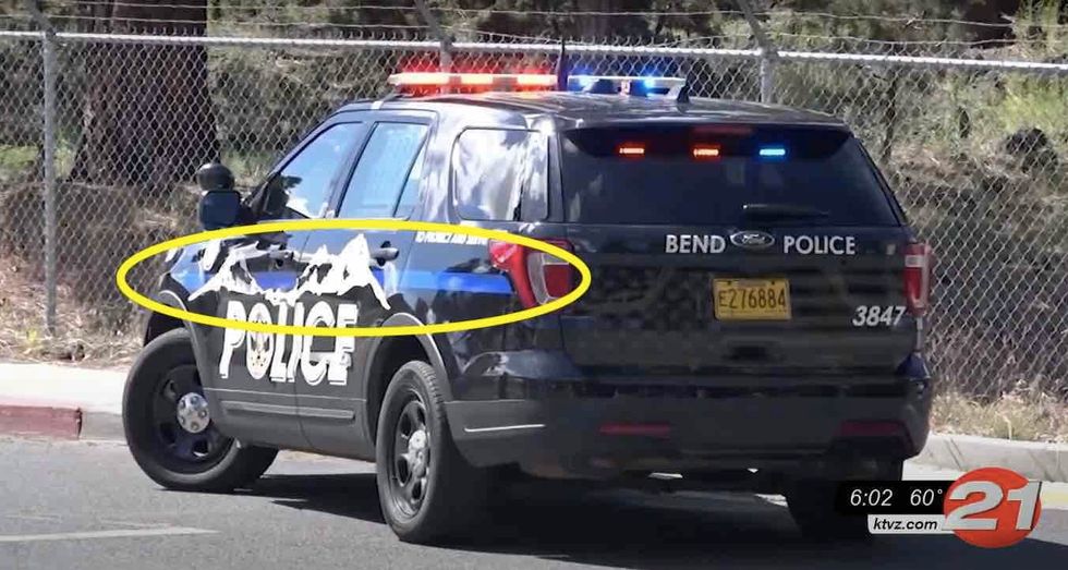 Patrol cars for the Deschutes County Sheriff's Office — Bend is located in Deschutes County — display a horizontal blue line across the back, and a few of the officers' vehicles show the black-and-white Thin Blue Line American flag, KTVZ said.