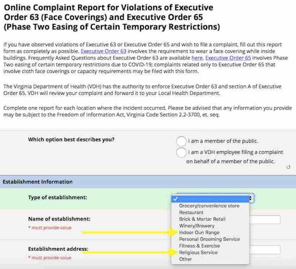 The Virginia Department of Health's website offers an online form to report "violations" of Democratic Gov. Ralph Northam's coronavirus executive orders — and specifically lists "religious service" and "indoor gun range" in a dropdown menu among six other options for establishments accused of violations.