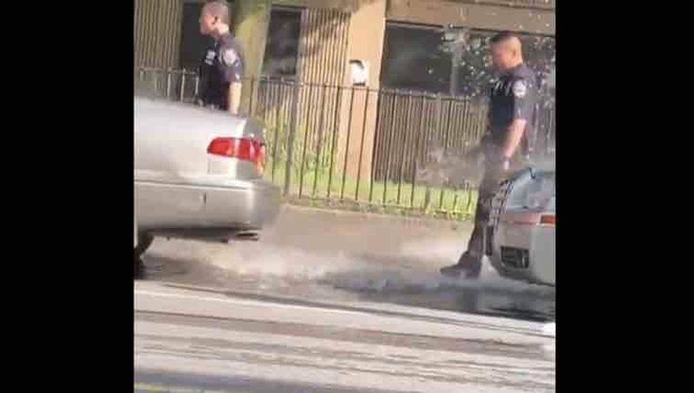 In the water dousing video, two officers are seen repeatedly getting water thrown and dumped on them — and the drenched cops simply walk away without reacting.