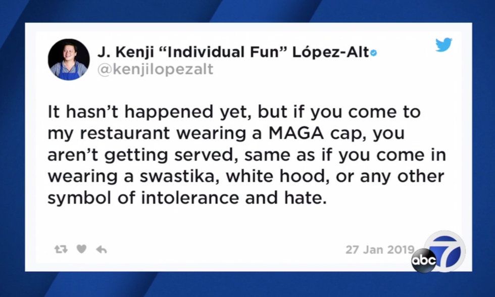 His original tweet — which has since been deleted — read, "It hasn't happened yet, but if you come to my restaurant wearing a MAGA cap, you aren't getting served, same as if you come in wearing a swastika, white hood, or any other symbol of intolerance and hate."