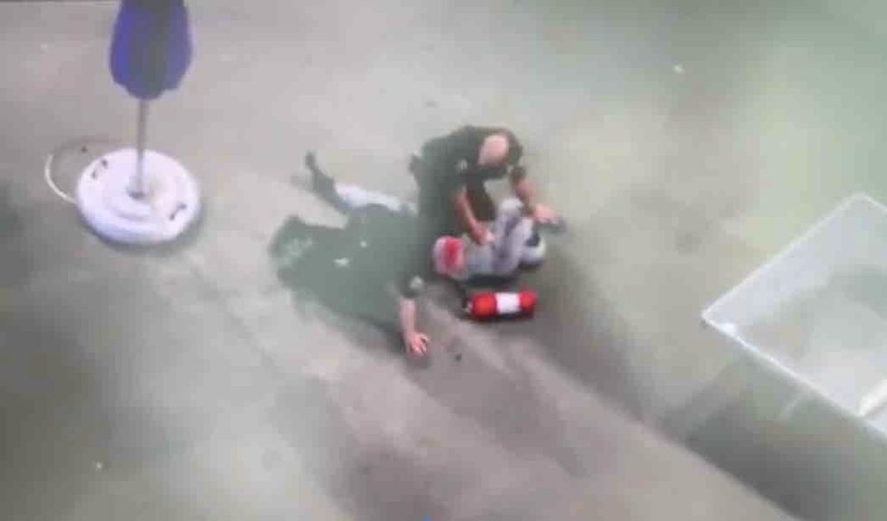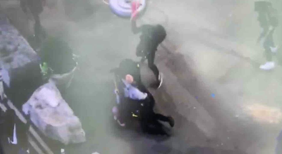One of the men — dressed in dark clothing and dark shoes — raises a fire extinguisher and slams it on the head of one officer who was facing the opposite direction and never saw it coming.