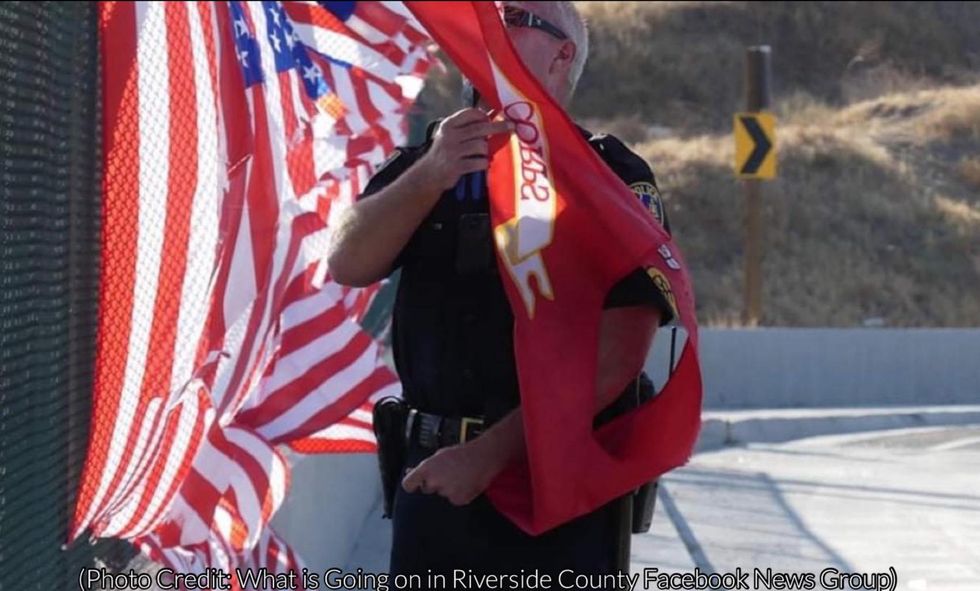 The Riverside Police Department in southern California published photographs of the vandalized flags on their Facebook page.