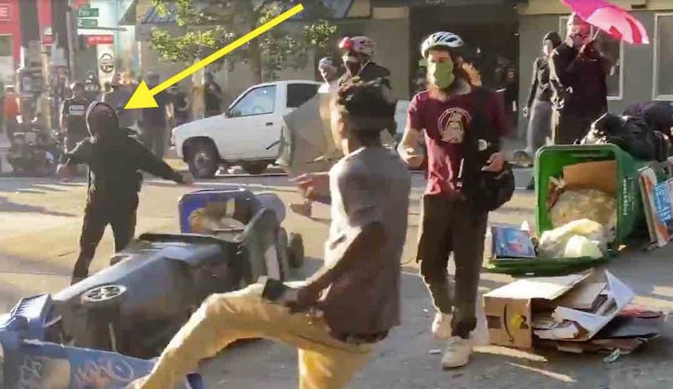 Another black man got on a megaphone and berated the BLM and Antifa faithful for the trash barricade. He got into arguments with several left-wing black men who didn't appreciate him throwing light on their pitiful gesture — and again, right on cue, a white man mustered up the gall to lecture him on his actions.