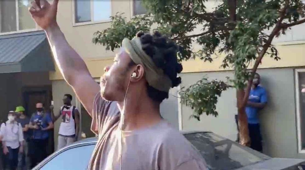 He then stalked in front of the barrier, raised his arm, and let out another "All Lives Matter!" chant right at the BLM throng. They tried to drown him out with a counter-"Black Lives Matter!" chant, but he kept right on going.