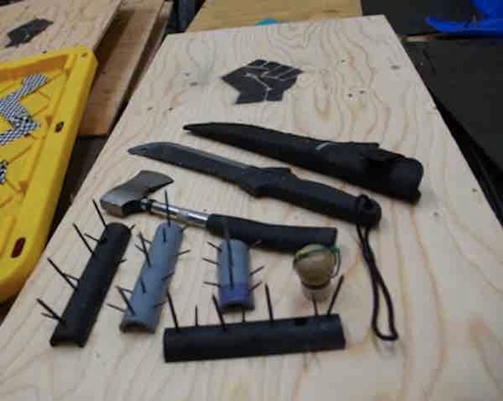 So officers obtained a warrant to search the tent and recovered a machete, hatchet, homemade spike strips, an unexploded mortar, and multiple makeshift shields, police said.