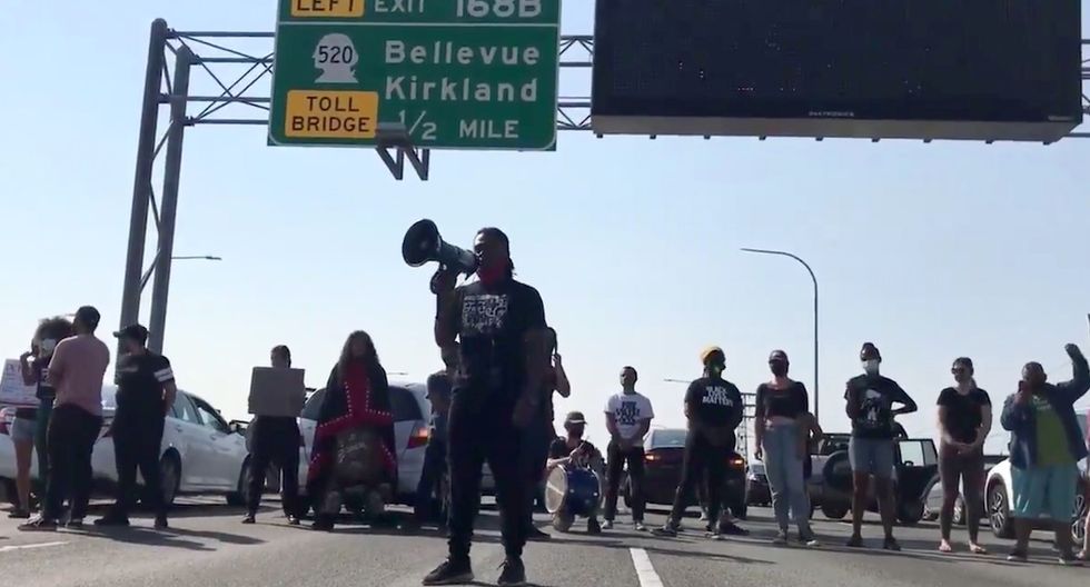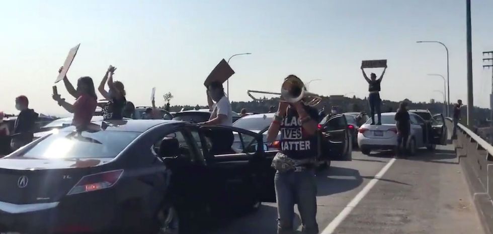 Protesters taking part in the "Morning March" demonstration celebrated when they interrupted the morning commute of hard-working people on Interstate Highway 5.