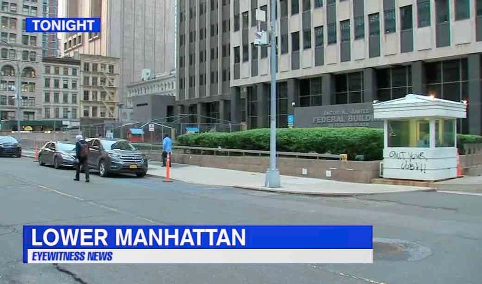The walkway leading to the building was spray-painted "FREE THEM ALL" and a security booth was tagged "QUIT YOUR JOB!!" as a lone officer sat inside it.