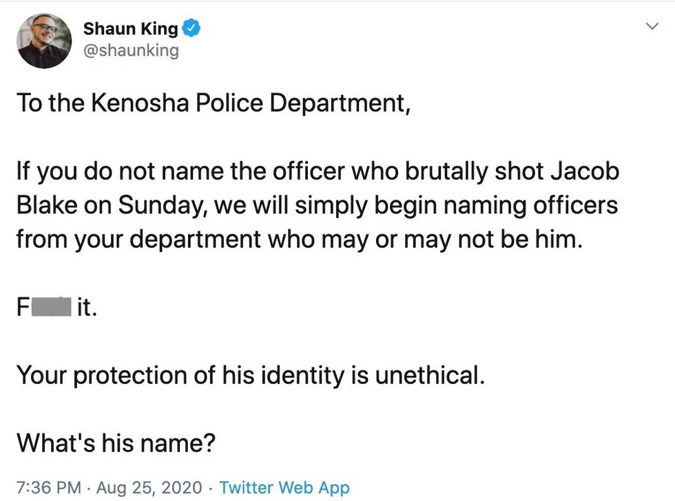 So it was not surprising to see King tweet a threat to the Kenosha Police Department on Tuesday that he and his ilk might just resort to essentially accusing various cops within the KPD of shooting Blake.