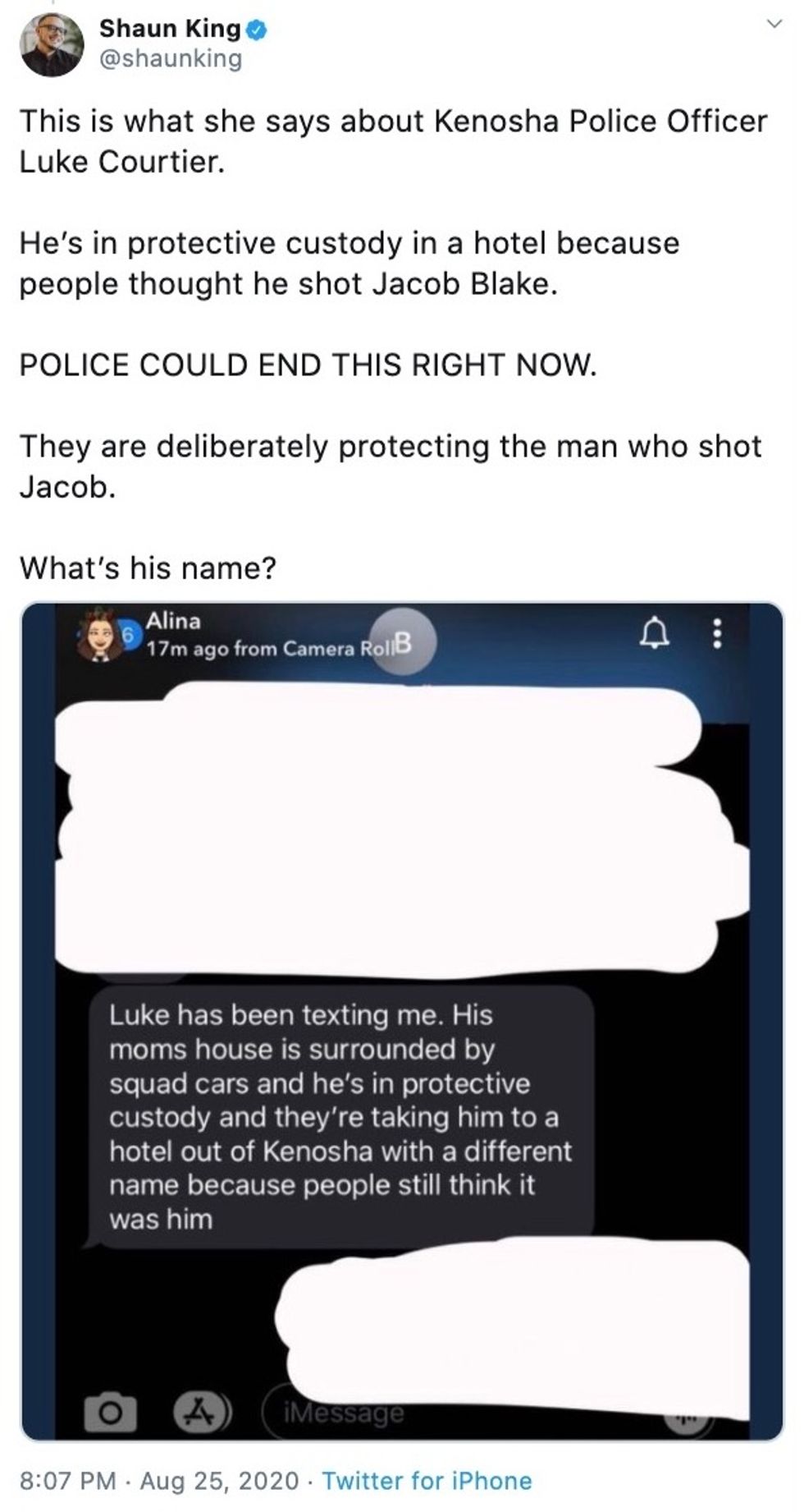 He followed that tweet with another post noting the case of a Kenosha officer named Luke Courtier who is reportedly in police custody because people merely believed he was the cop who shot Blake.