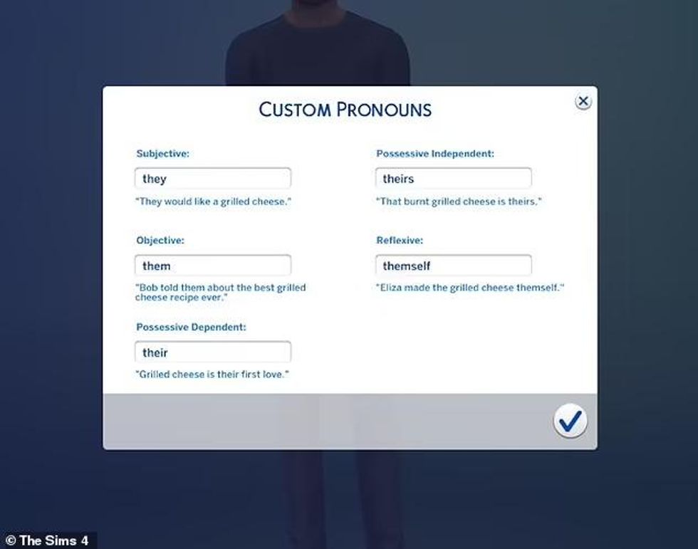 The Sims 4 also includes a complex set of pronoun customizations, with an array of options for implementing a user's preferred pronouns.