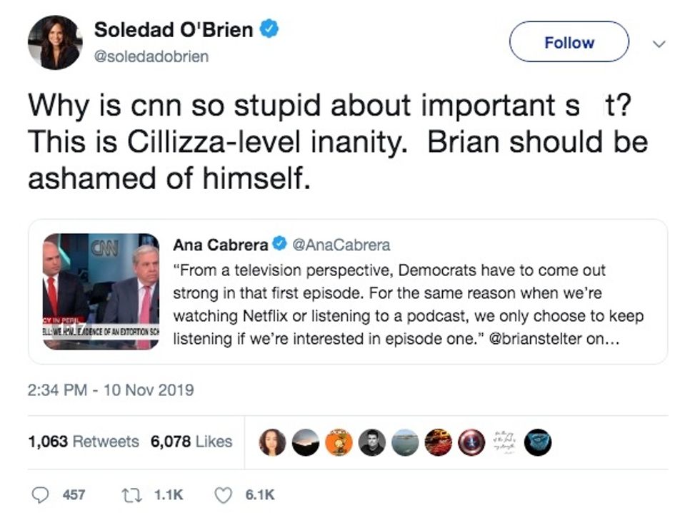 Soledad O'Brien rebuked CNN host Brian Stelter on Sunday for being concerned with the entertainment value of the public impeachment inquiry hearings.