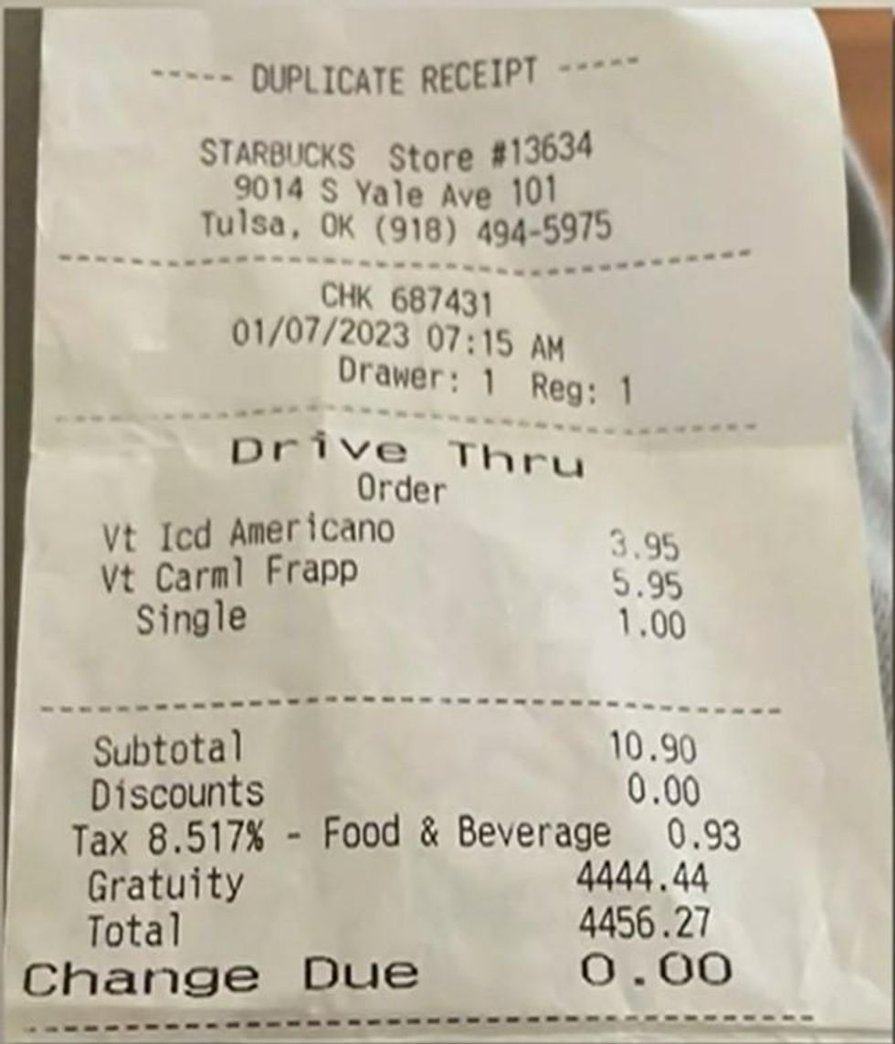 On January 7, Jesse O'Dell went through the drive-thru of a nearby Starbucks in Tulsa, Oklahoma. For almost 16 years, Jesse made that trip almost every day, ordering an iced Americano for his wife, Deedee, and a caramel frappuccino for himself, which usually cost him just over $11. But on that day, a mysterious $4,444.44 gratuity was somehow added to the bill, bringing the total charged to his credit card to a staggering $4,456.27.