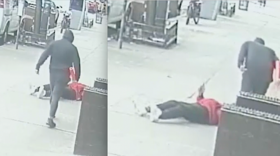 After the victim falls to the sidewalk, the suspect is seen walking away — but then returning and appearing to yell at and stomp on the victim, the cable network said.
