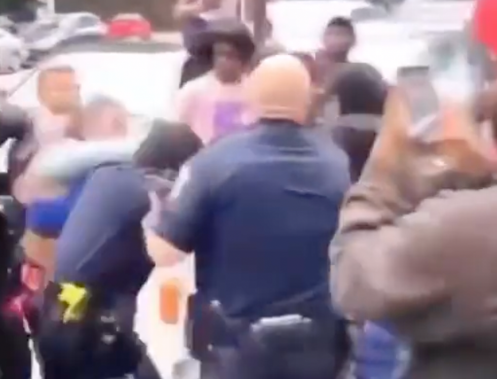 As police held on to Davis, another woman was seen in the video trying to pull police off her — and even apparently spitting on one of the officers: