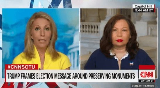 Show host Dana Bash asked Duckworth: "Senator, I know that you support change in the name of military bases named after Confederate leaders, but there are leaders like George Washington and Thomas Jefferson who were slave owners. And some people are demanding their monuments come down, too. In your view, where does it end? Should statues, for example, of George Washington come down?"