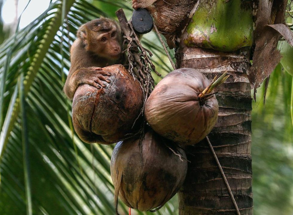 When not being forced to pick coconuts or perform in circus-style shows for tourists, the animals were kept tethered, chained to old tires, or confined to cages barely larger than their bodies. After a global outcry, the coconut industry claimed to have changed this practice—but PETA Asia's second investigation found producers still using monkey labor and industry insiders discussing how farms conceal this practice by simply hiding monkeys until auditors leave or by hiring contractors to bring in monkeys only during harvest time.