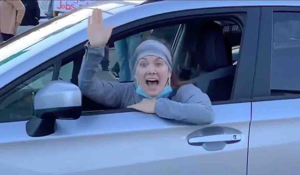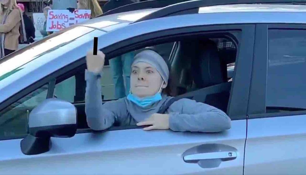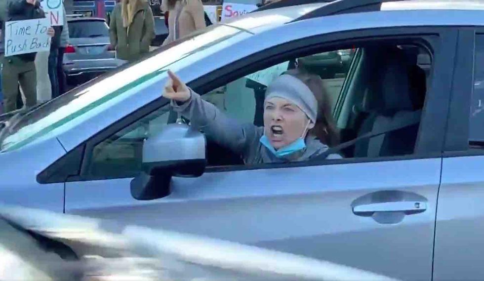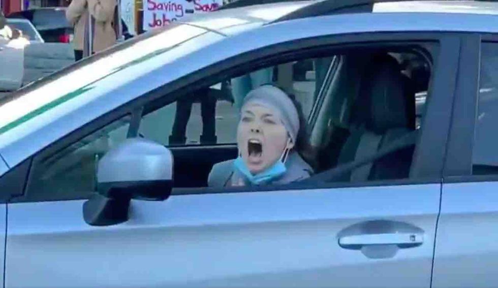 Wearing a headband with her COVID-19 mask dangling below her chin, the ponytailed leftist lets loose on protesters: "Bitch! Kill yourself!"