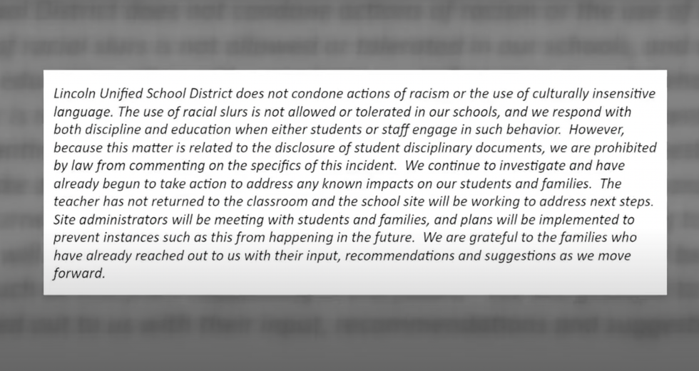 The following is a school district statement on the matter, according to KXTV. The statement was issued before the teacher's resignation: