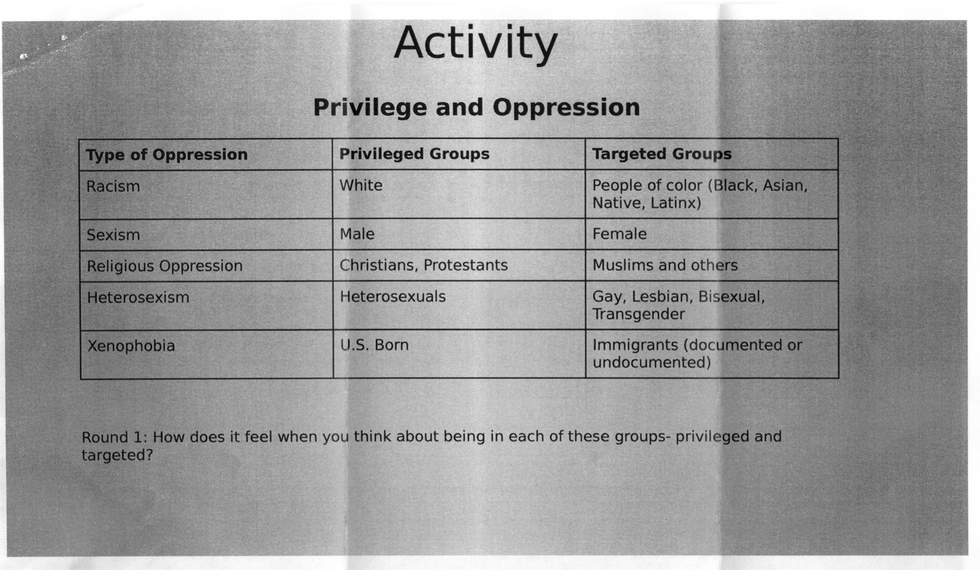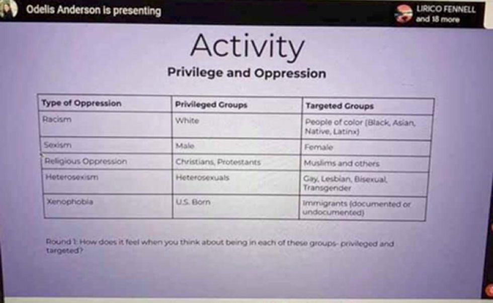 Then, according to the lesson plan, which the school confirmed as real in an email to TheBlaze, students were asked to view a chart describing different types of oppression as well as "privileged groups" and "targeted groups" and assess which category they belonged in.